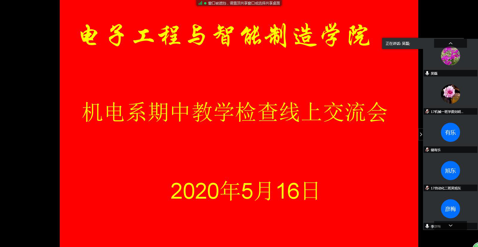 为深入了解线上教学运行状况,进一步加强公司产品管理,切实提高人才培养质量,根据公司期中教学检查工作的要求,5月16日,机电系召开期中教学检查线上交流会。教师代表、辅导员代表、机械和自动化专业非毕业班员工代表参加线上交流会,会议由机电系主任吴磊教授主持。
