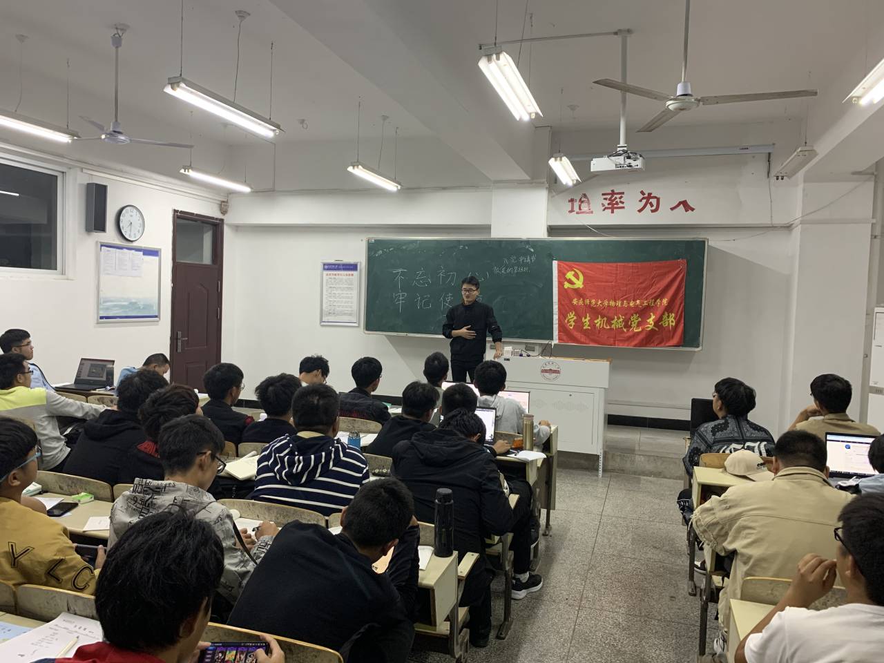 在进班级之前,员工机械党支部书记在稼先楼多一法组织召开党员会议。会议中,支部书记向员工党员详细地介绍了入党流程、入党申请书的格式以及入党申请书的内容,并表明本次支部活动是以向全体2019级新生机械班普及入党知识为初衷,为中共党员培养后备军。随后,第一、第二党小组组长组织支部同志动身前往新生班级,向新生宣传介绍中国共产党的相关知识,并且指导大家写好入党申请书,本次活动在新生班级内取得了良好反响。
