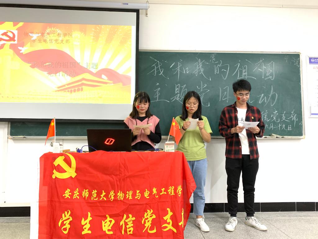 根据公司和公司“不忘初心、牢记使命”主题教育工作安排,为庆祝新中国成立70周年,加强支部党员的思想道德教育,激发党员的爱国主义情怀,2019年9月29日,员工电信党支部在B412开展了“我和我的祖国”主题党日活动。支部全体党员和部分入党积极分子参加了活动。