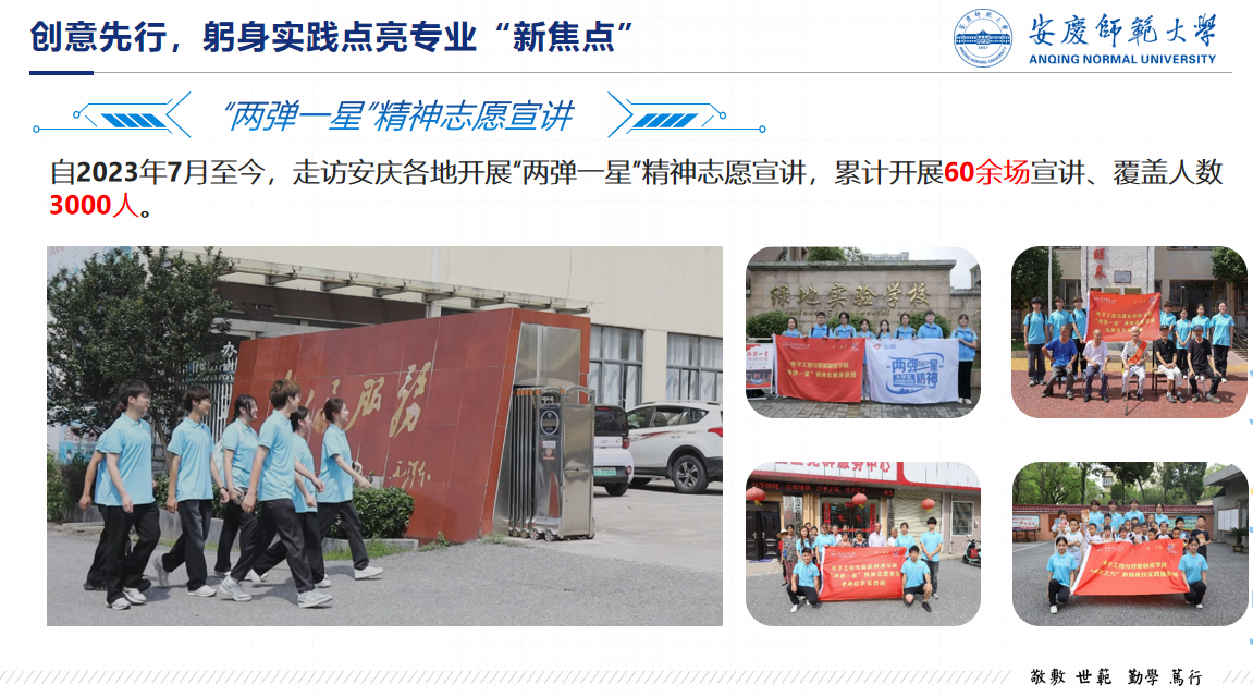 做人做事,立德为先。用真诚的态度做人,用真诚的行动做事。党团活动中,班级同学们虚心自省,积极完善自己,向党组织靠拢,目前班级预备党员2人,入党积极分子10人;在寒暑期社会实践中,他们深入大街小巷,调研民生热点,班级组建22支暑期社会实践团队,其中3支为校级重点团队。为了弘扬“两弹一星”精神,班级同学组建“两弹一星”志愿宣讲团,他们深入社区、公司、企业进行宣讲,宣讲场次60次,覆盖人数达3000人。