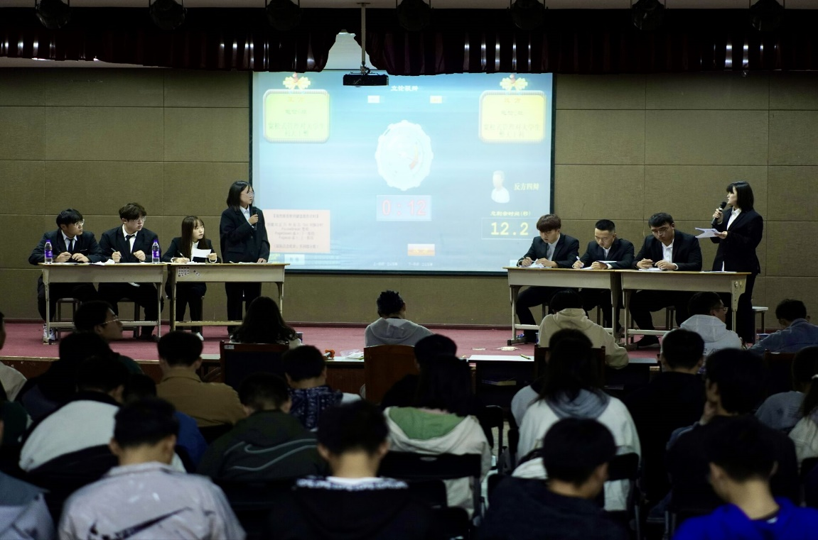 本次比赛共有立论驳辩、驳论对辩、盘问小结、自由辩论、结辩和观众提问六个环节,正反双方围绕着辩题“弱肉强食是否为社会法则”展开辩论。比赛全程,正反双方结合自身所持观点,轮流发言,在自由辩论环节,双方辩友更是展开激烈“舌战”。