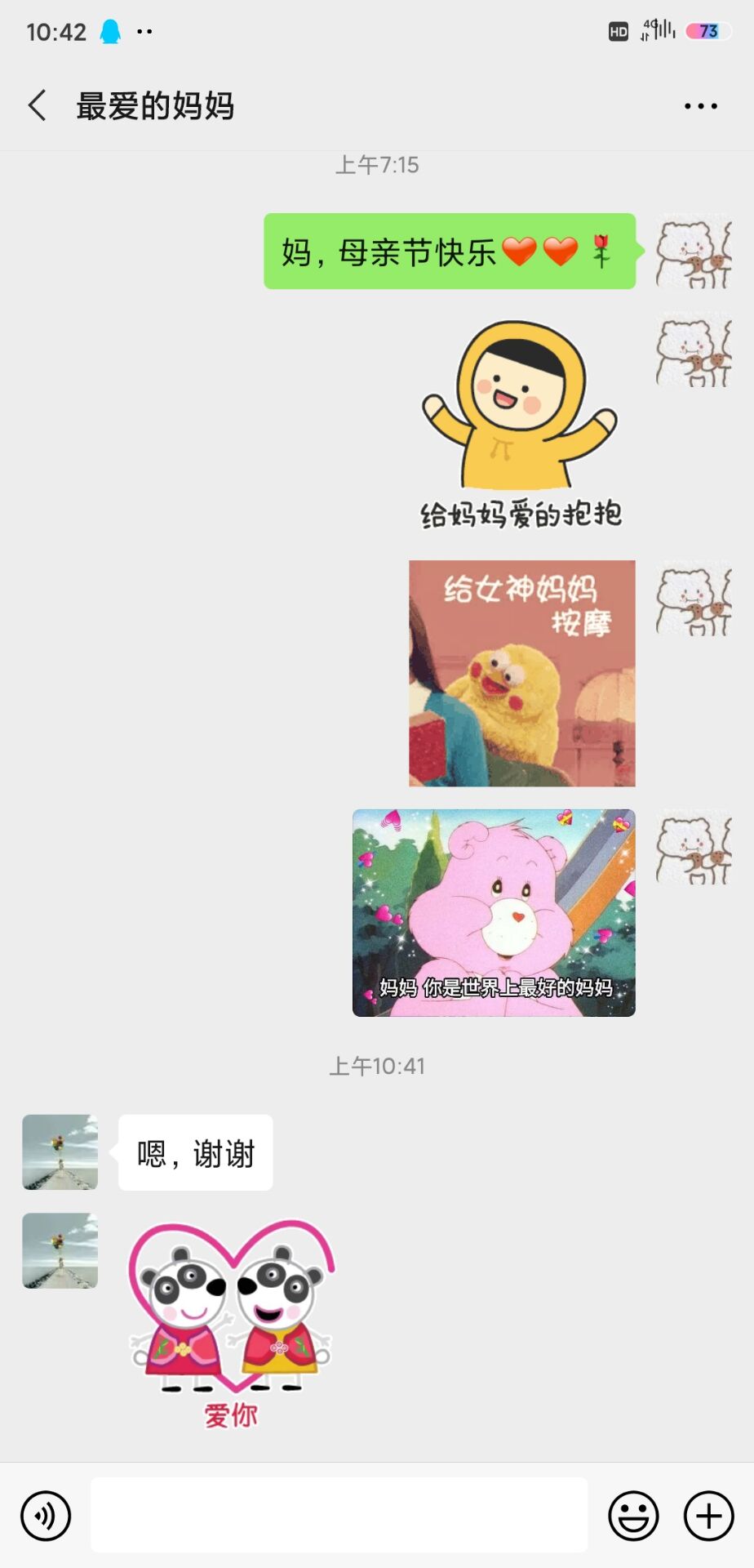 同学们将自己的作品发给母亲,以这种方式表达对母亲深深的感恩和思念,也让更多的同学接受感恩教育,将中华民族传统美德发扬光大!同时鼓励发动同学们将自己与母亲或者其他亲人的照片展示出来,秀恩爱,秀出不一样的恩爱。电信2019级郑冰雨说:“亲爱的妈妈,岁月的磨砺让您的青春老去,风雨的洗涤让你的红颜褪色,但是在女儿的心中您永远如花一样的惊艳。祝妈妈节日快乐!”