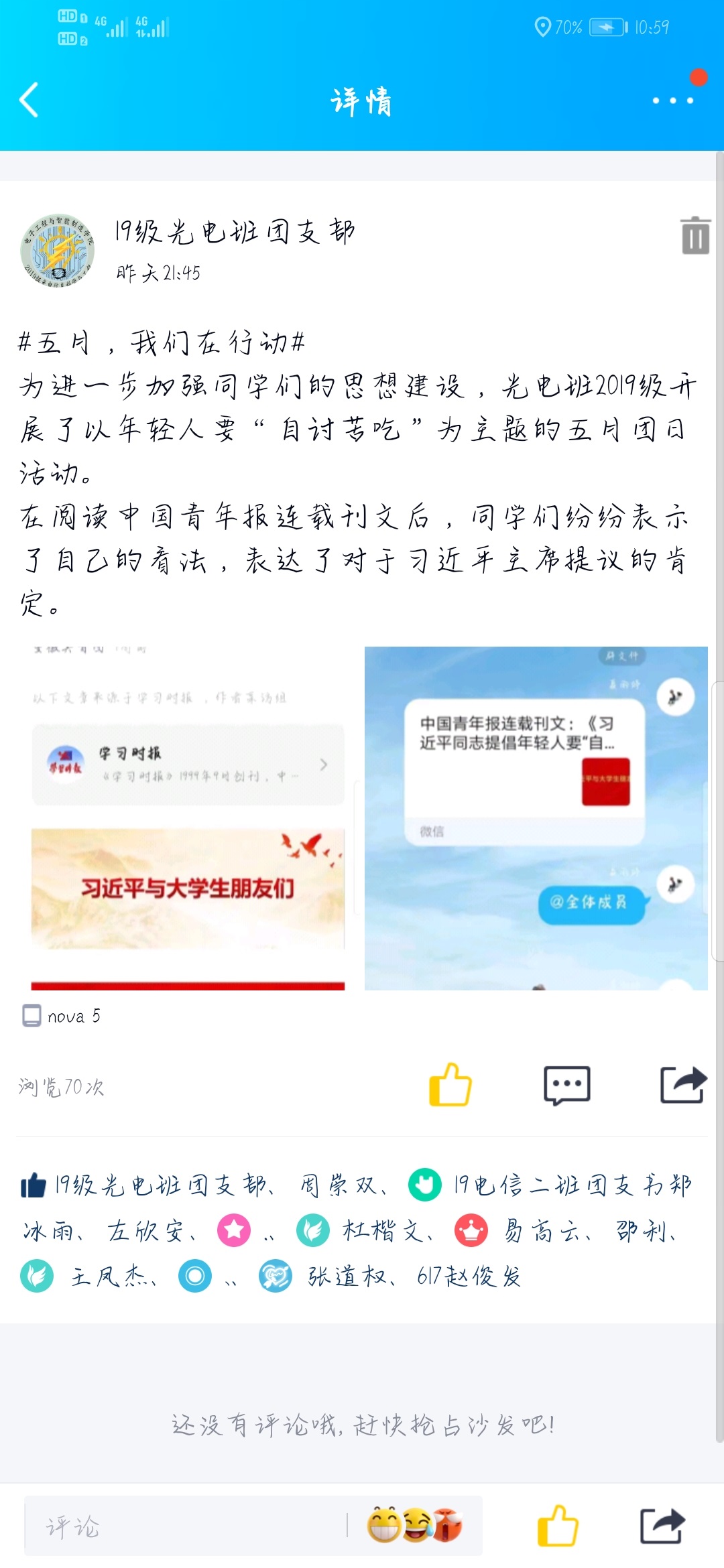习近平总书记所提倡的年轻人要“自找苦吃“让光电班全体同学竖立起了自己的目标,定会将习近平总书记的教诲牢记心中,学会“自找苦吃”,真正做到吃苦在前,享乐在后。肩负起社会主义现代化建设的众任,为中华民族的未来贡献自己的全部力量。(秦汉)