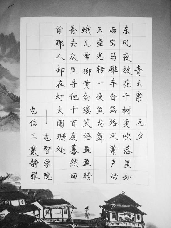 太阳成集团122ccvip2020级电子信息专业的戴静雅同学积极参加比赛,成功进入了硬笔组、软笔组和粉笔组的决赛,并取得了硬笔组一等奖、粉笔组一等奖、软笔组二等奖的好成绩。戴静雅同学说自己从小就练习书法,对书法有着浓厚的兴趣,并表示“如果以后有书法相关的活动也会积极参加。”