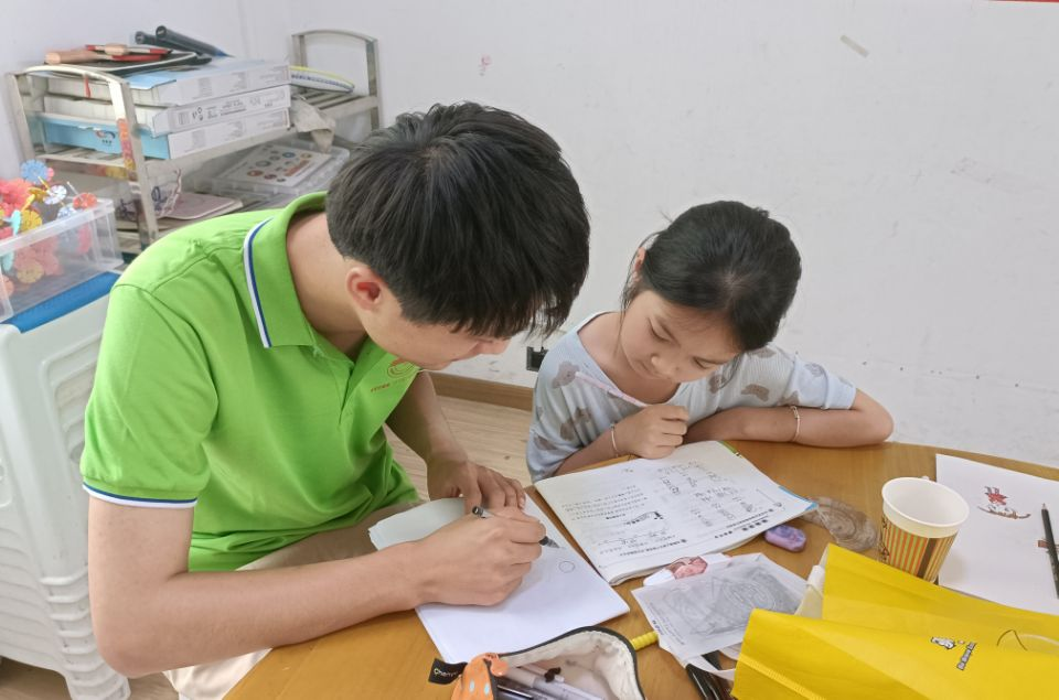 安排作业、课后检查、错题讲解……一道教学“流水线”工程在小学课程教育的教室里展开,检测出员工们的薄弱点后再对症下药。执笔在草稿纸上演算的同时留心观察着员工的反应,团队成员、通信工程专业(2)班的宋宇接连两天为同一名员工辅导功课。“经过作业检查,员工们语文阅读理解比较薄弱,数学课外计算有待提高。”他坦言。
