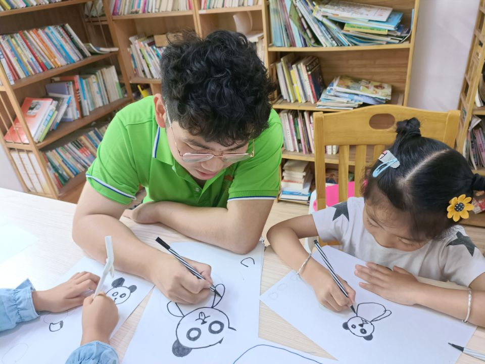 “先画一个圆圆的脑袋,再给脑袋安装两个黑色的耳朵。”在小朋友们要求下,团队成员、电子信息科学与技术专业2020(1)班的汪自瑞带领小朋友们拿起彩笔开始手绘大熊猫。他一边向孩子们介绍着大熊猫的外貌特征,一边查看小朋友们的绘画情况。