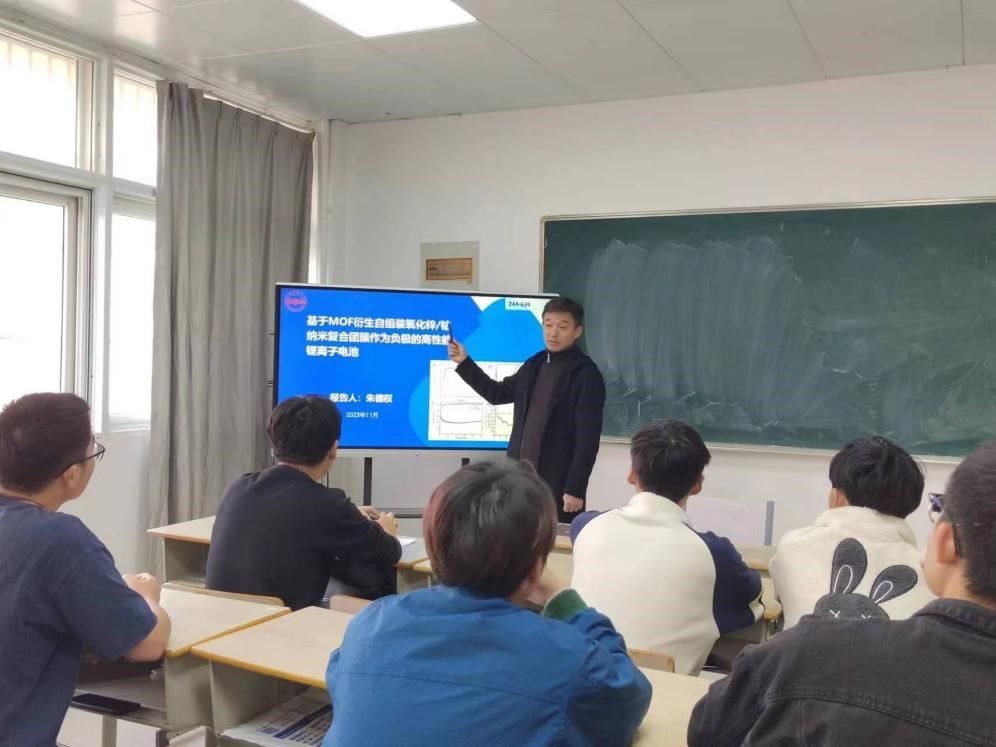 11月29日,太阳成集团122ccvip朱德权副教授作了题为“基于MOF衍生自组装ZnO/Co3O4纳米复合团簇在高性能锂离子电池中应用”的学术报告。2021级电子信息专业部分本科生聆听了报告,报告由光电教研室主任祝祖送副教授主持。