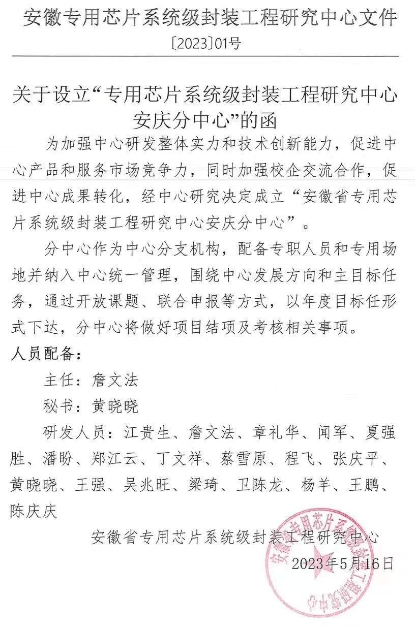 为加强专用芯片研发实力和技术创新能力,强化校企交流合作,安徽专用芯片系统级封装工程研究中心决定在公司设立安庆分中心,并由副经理詹文法教授担任分中心主任。分中心将依托公司学科优势、人才优势,瞄准集成电路封装测试的技术创新和产业化关键技术研发,开展集成电路封装测试在设备控制、封装工艺、封装材料制备等方面的工程化问题研究,提高集成电路封装测试技术水平,促进产业发展和技术创新。