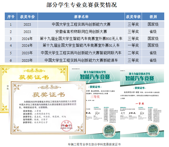 本专业立足于应用型人才培养定位,注重倡导员工科学精神和创新精神培养,通过加强指导教师队伍与竞赛平台建设,将学科竞赛与学科专业紧密联系起来。近五年来,车辆工程专业员工获得国家级、省级奖项20余项。