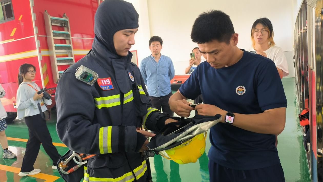 在消防员的带领下,同学们先后对消防车与消防器材进行了参观学习。在参观消防车辆时,消防救援人员通过现场演示及讲解的方式向同学们介绍了各类消防车的名称、功能、操作事项以及各类救援装备在灭火救援中的用途,并让同学们近距离观察了消防车的操作过程。接着,消防员们为全体员工进行了消防器材的展示,以及各种防护服,在讲解完各种功能不同的作战服的用途后,同学们在消防员的帮助下穿上了消防作战服,切身体验了消防员的工作状态,感受到了消防员的辛苦。