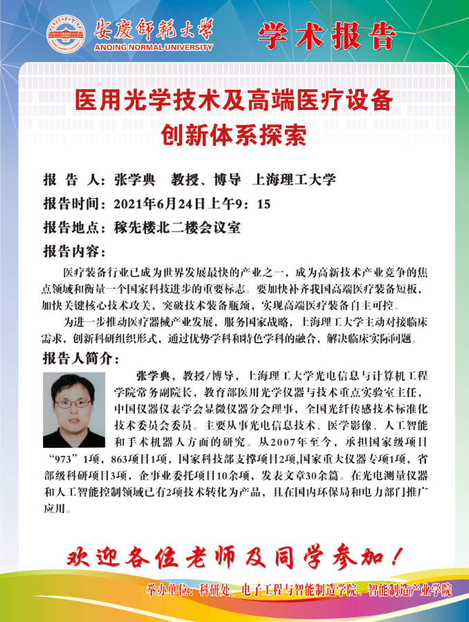 上海理工大学张学典教授关于“医用光学技术及高端医疗设备创新体系探索”学术报告通知(202108)